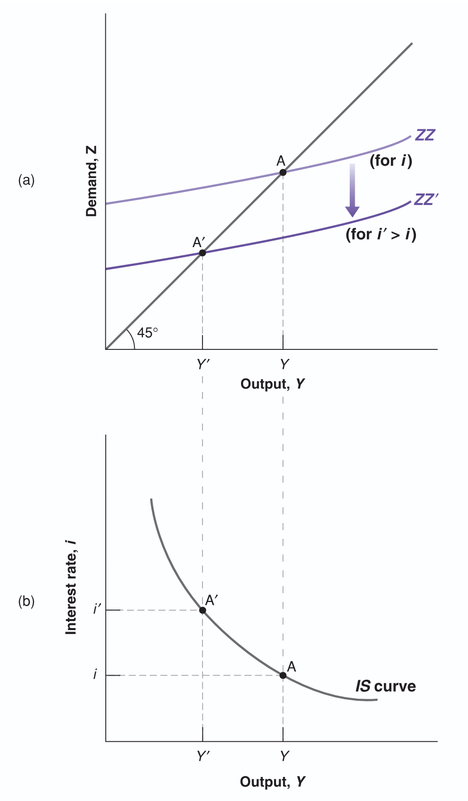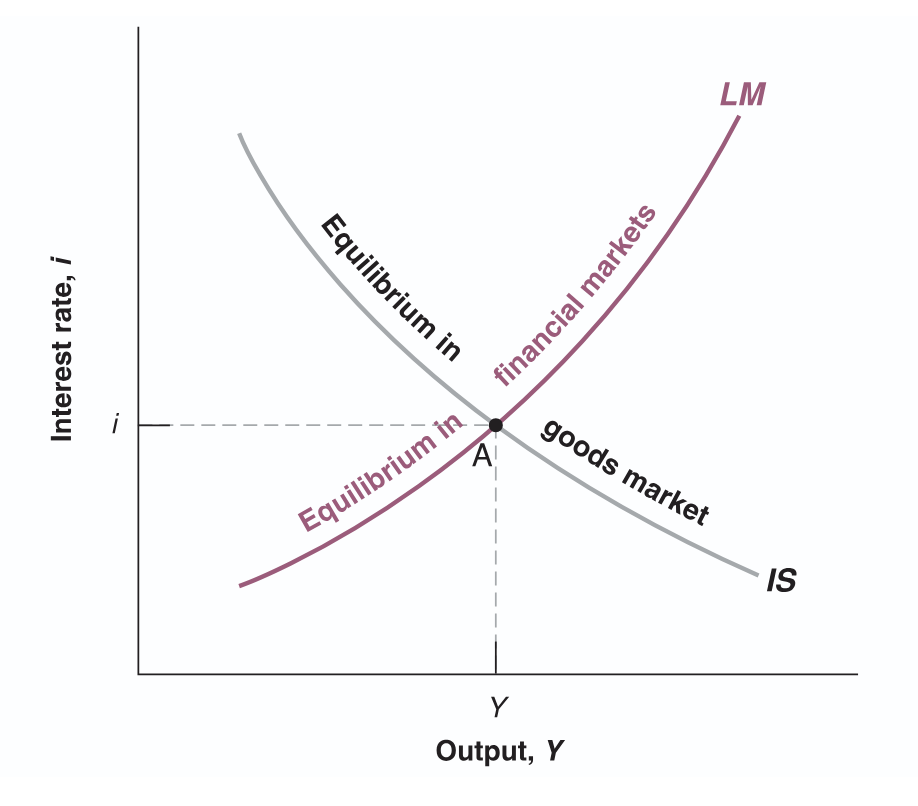 - increase in interest rate decreases investment, decrease in investment leads to decrease in output, which further decreases consumption and investment thru multiplier